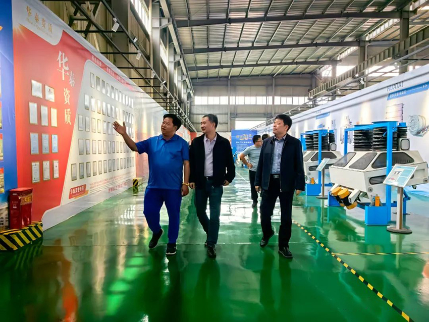 河工大設(shè)計(jì)研究院張虎總工一行蒞臨華泰智能裝備集團(tuán)調(diào)研 5月9日,河南工業(yè)大學(xué)設(shè)計(jì)研究院張虎總工一行在滑縣人民政府副縣長李紅斌、滑縣糧食局局長孫永生的陪同下蒞臨華泰智能裝備集團(tuán)實(shí)地調(diào)研考察,河南省人大代表、河南華泰智能裝備集團(tuán)董事長閆子鵬陪同調(diào)研。